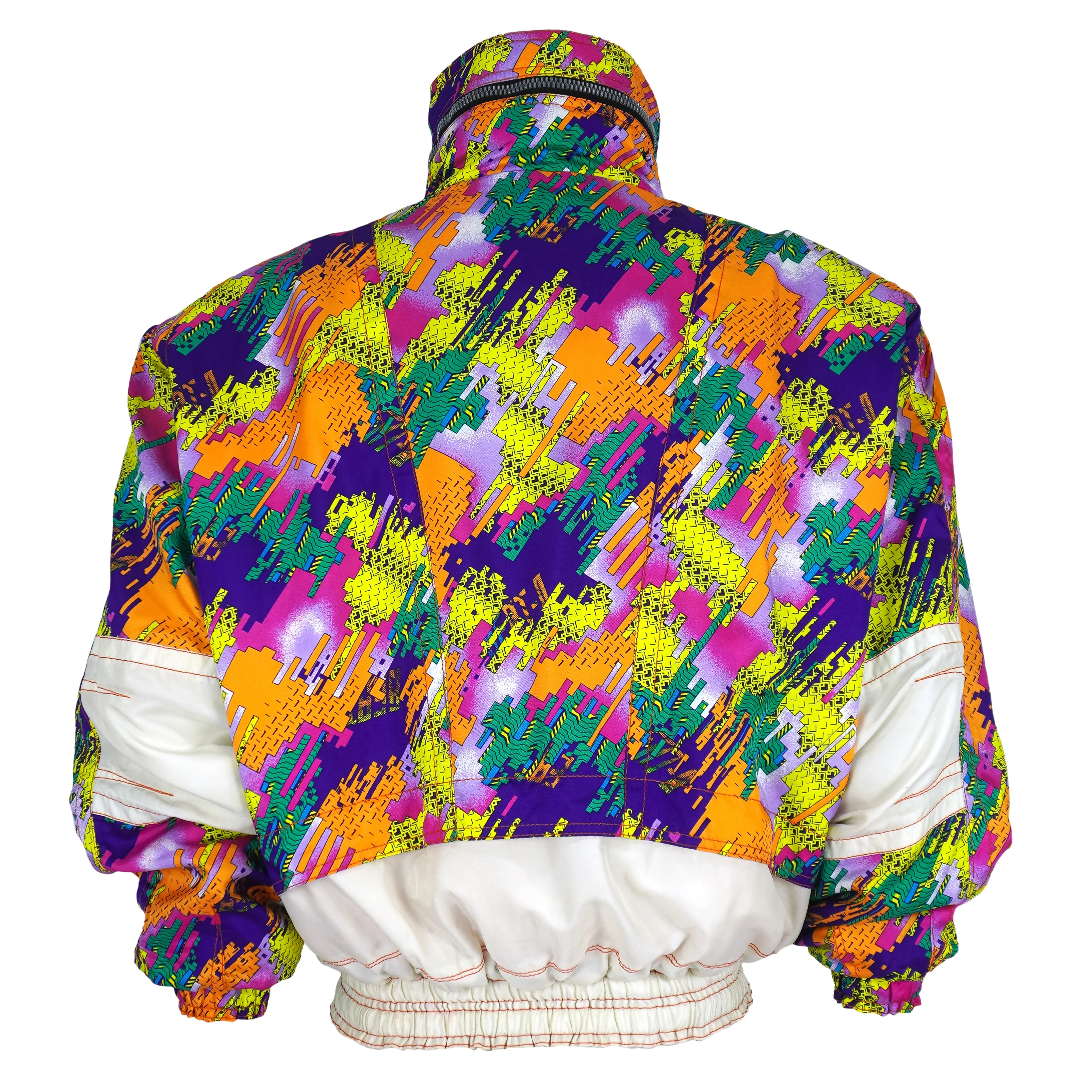 1990s Vintage Button-Up Abstract Pattern Ski Jacket by Competition. White with multicolor in color, fitting a medium size with discoloration and is otherwise in very good condition.