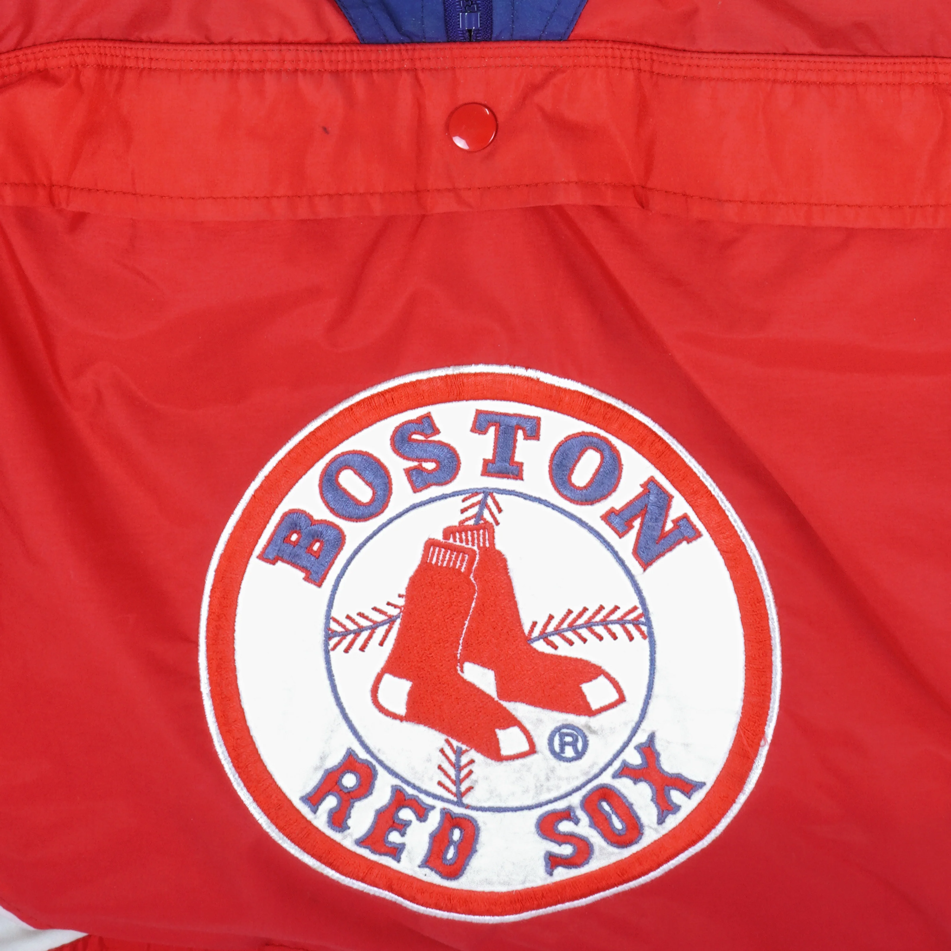 1990s Vintage MLB Boston Red Sox Big Logo 1/2 Zip Hooded Windbreaker by Nutmeg. Blue with red in color, fitting large size and is in excellent condition.