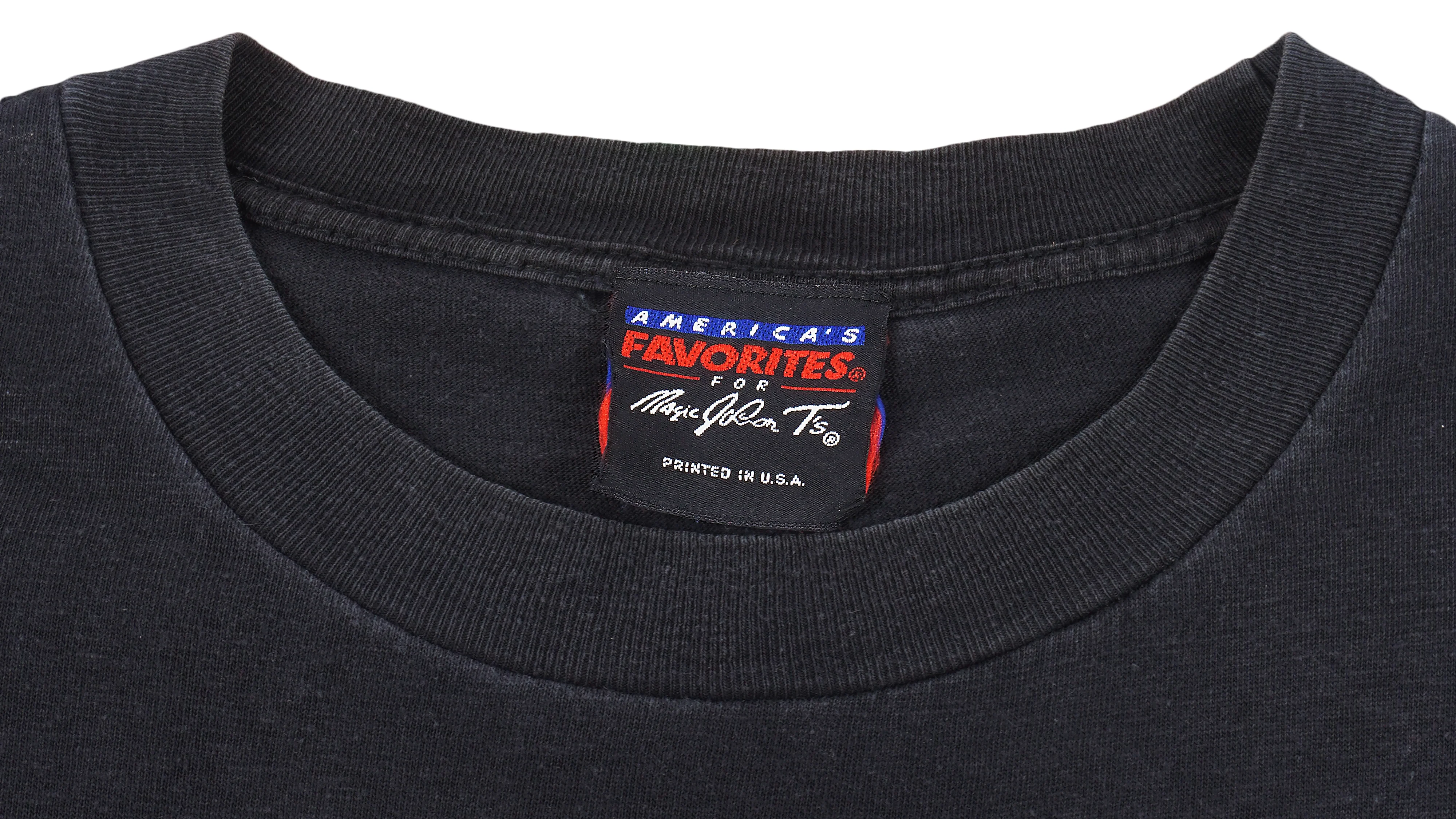 1990s Vintage NBA Magic Johnson Ts Chicago, Bulls Big Spell-Out T-Shirt. Black in color, tag in medium but fits like large size and is in excellent condition.