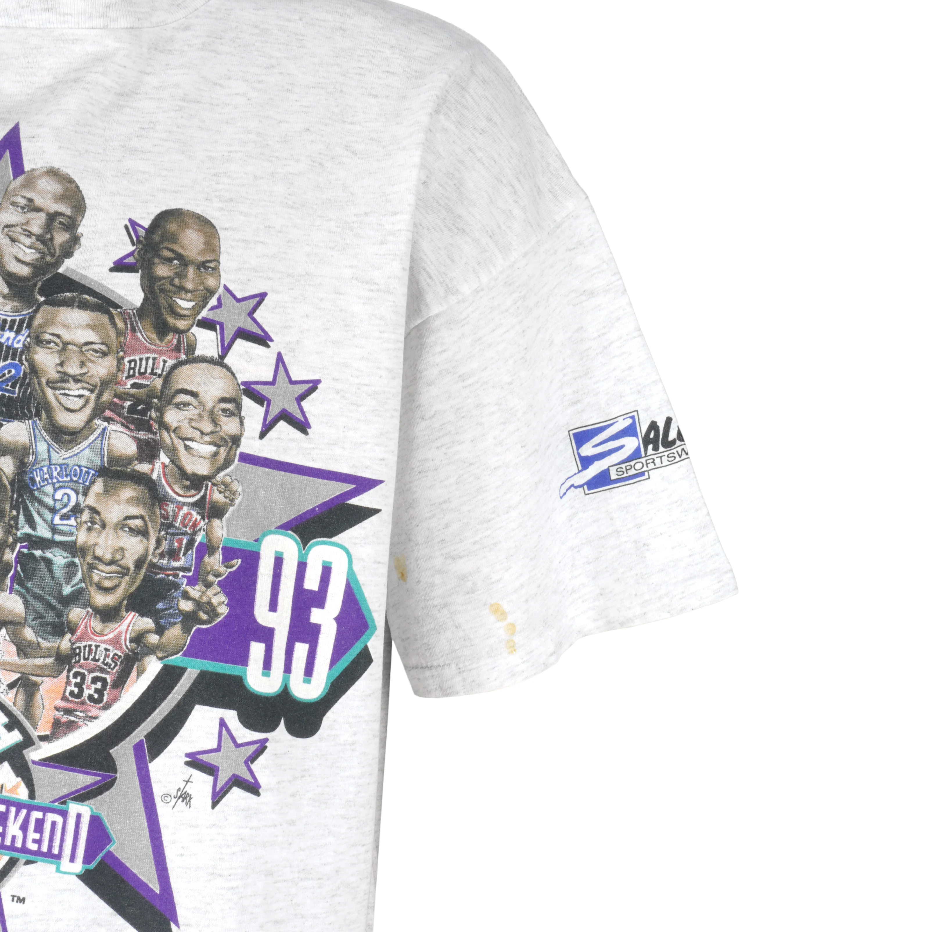1993 Vintage NBA Utah Jazz All Stars Game East VS West Caricature Single Stitch Big Spell-Out T-Shirt by Salem. Grey in color, fitting X-large size and is in excellent condition.