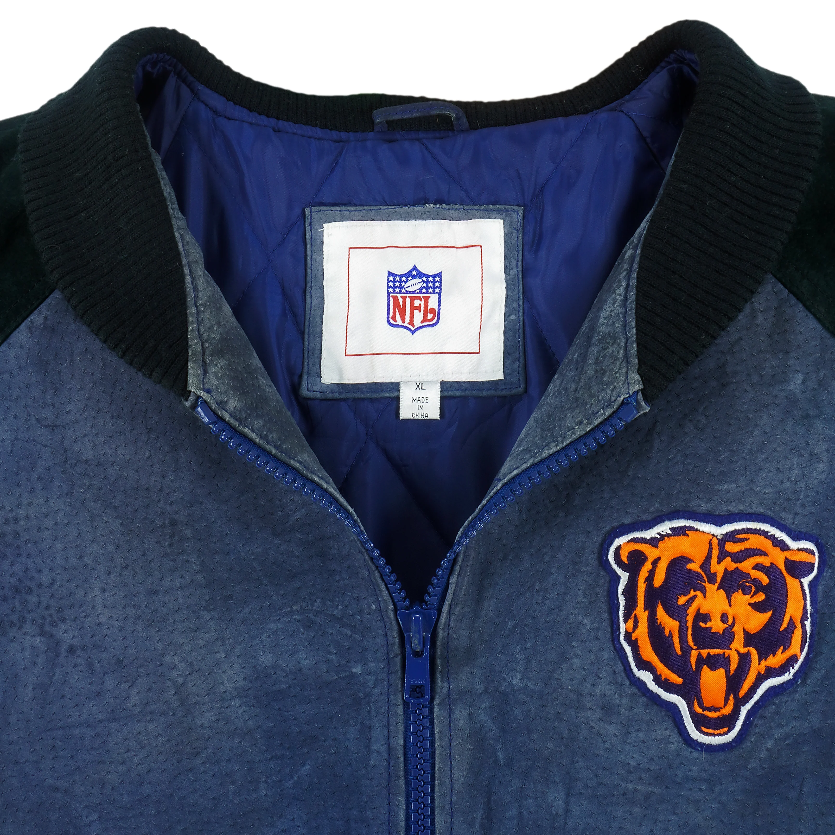 1990s Vintage NFL Chicago Bears Zip-Up Leather Jacket. Black and blue in color with big back team logo. Fits X-large size and is in very good condition.