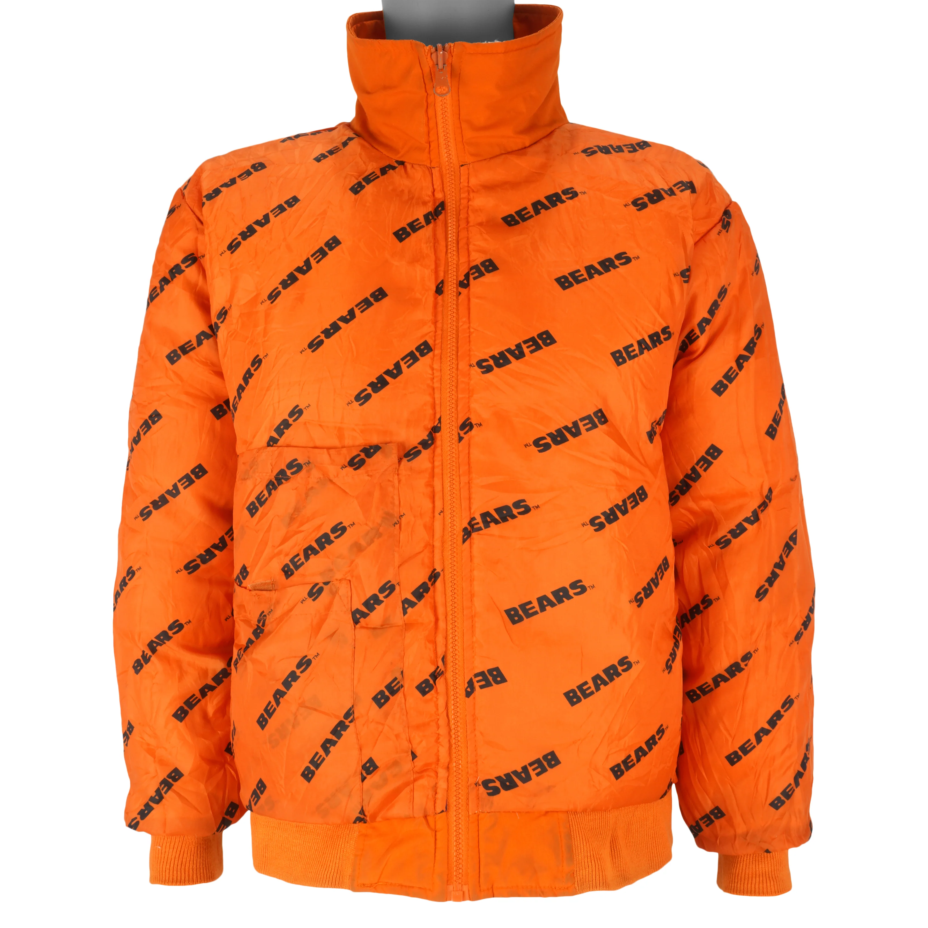 1990s Vintage NFL Chicago Bears Monogram Reversible Jacket. Orange in color, spell-out, fits a medium size with signs of wear, minor marks and is otherwise in very good condition.