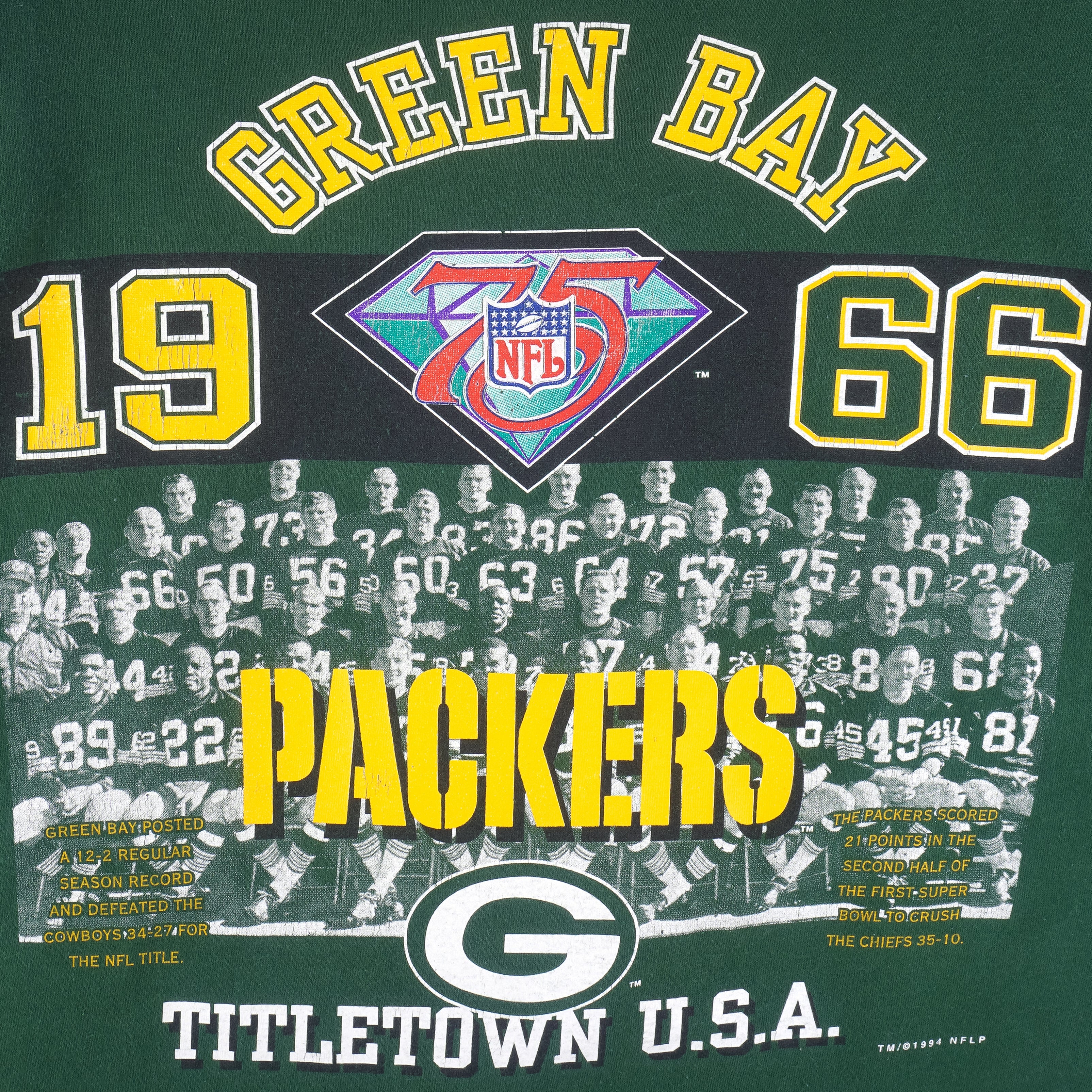 1994 Vintage NFL Green Bay Packers Champs 1966 Titletown U.S.A. T-Shirt by GTS. Dark green in color, old team players from the 60s, fits large size and is in excellent condition.