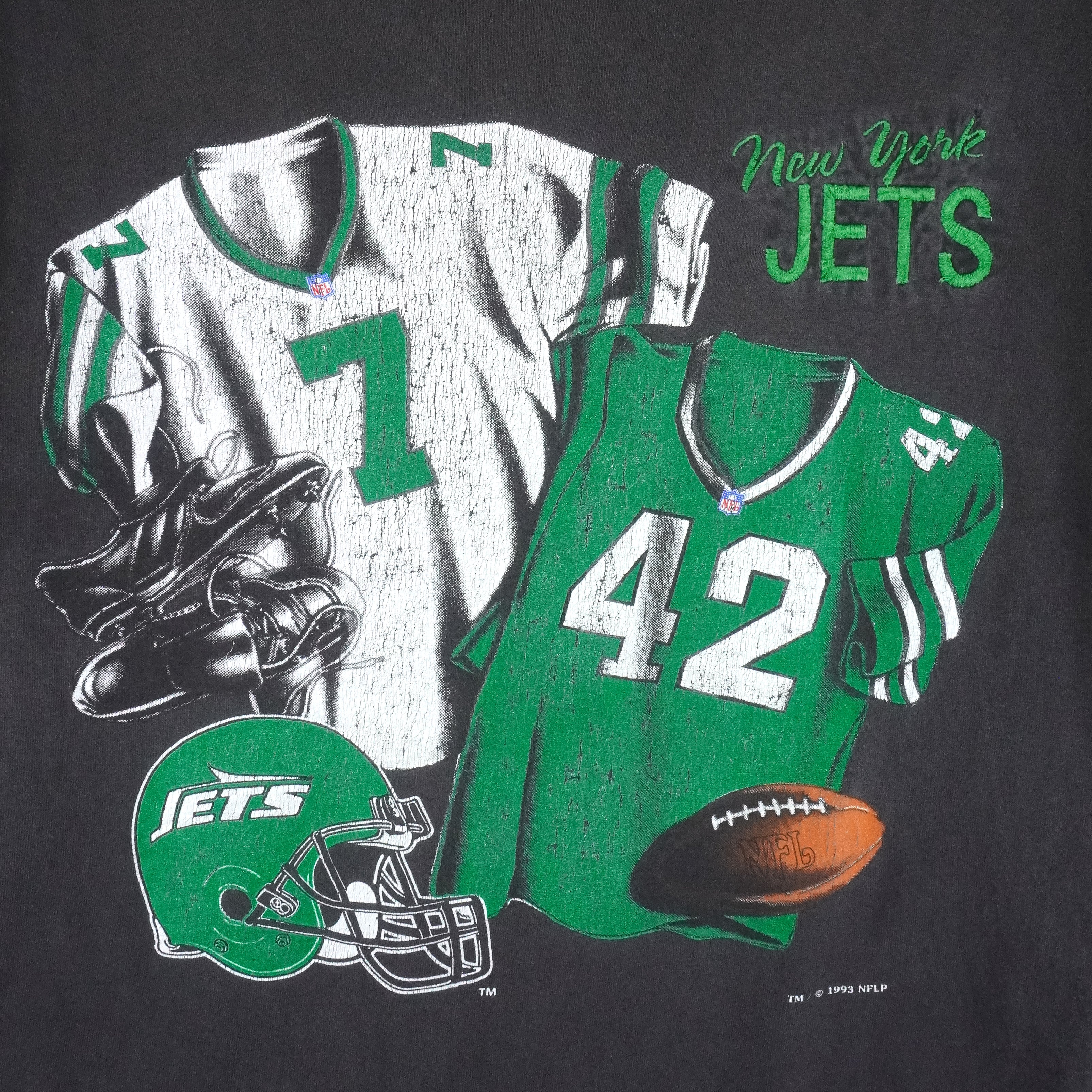 1993 Vintage NFL New York Jets Locker Room Single Stitch T-Shirt by Nutmeg. Black in color, tag is medium but fits like large size and is in very good condition.