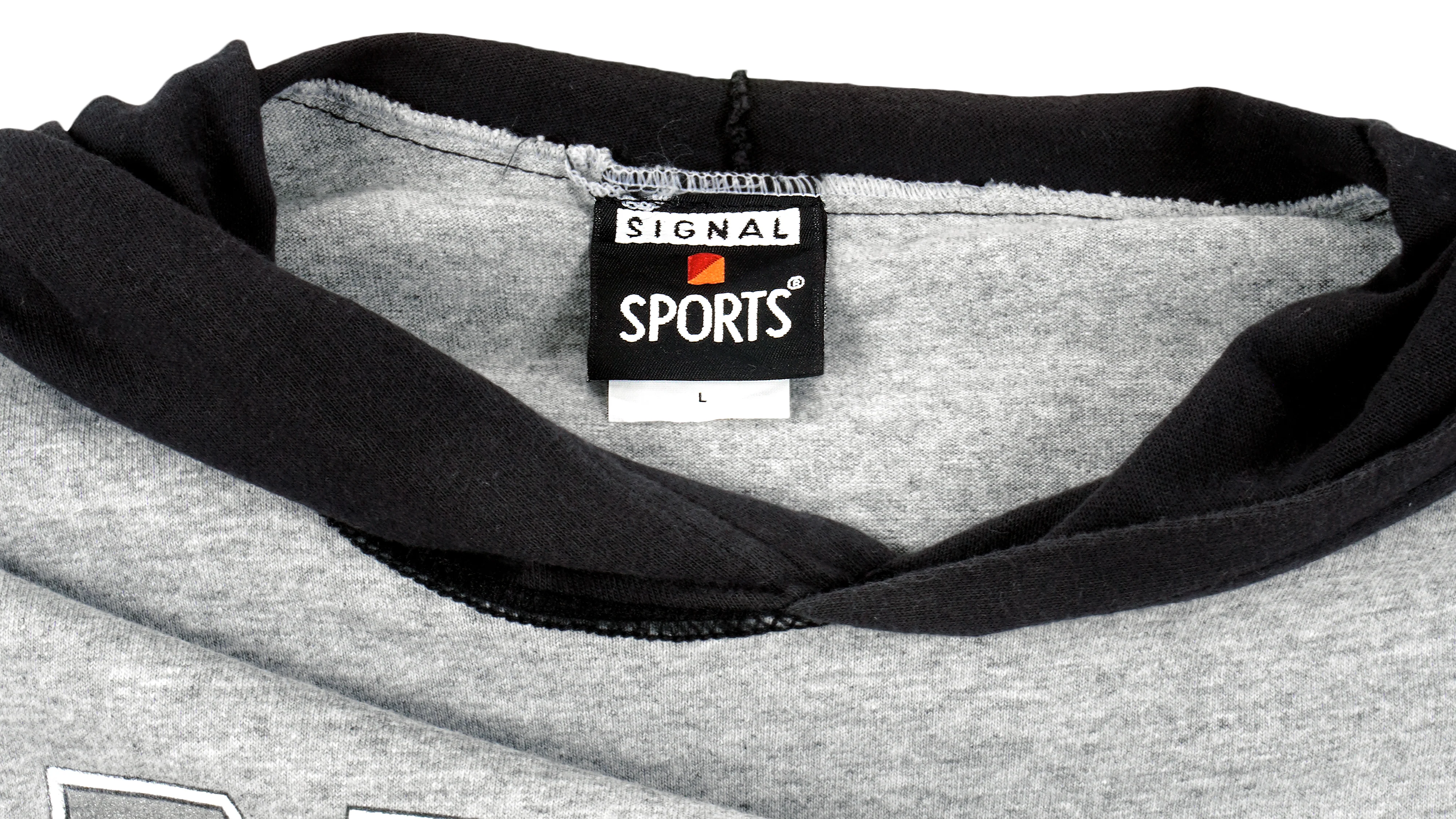 1994 Vintage NFL Oakland Raiders Big Logo Hooded Sweatshirt by Signal Sports. Grey with black in color, tag shows large but fits like a medium tall size with signs of wear, fading area and is otherwise in very good condition.