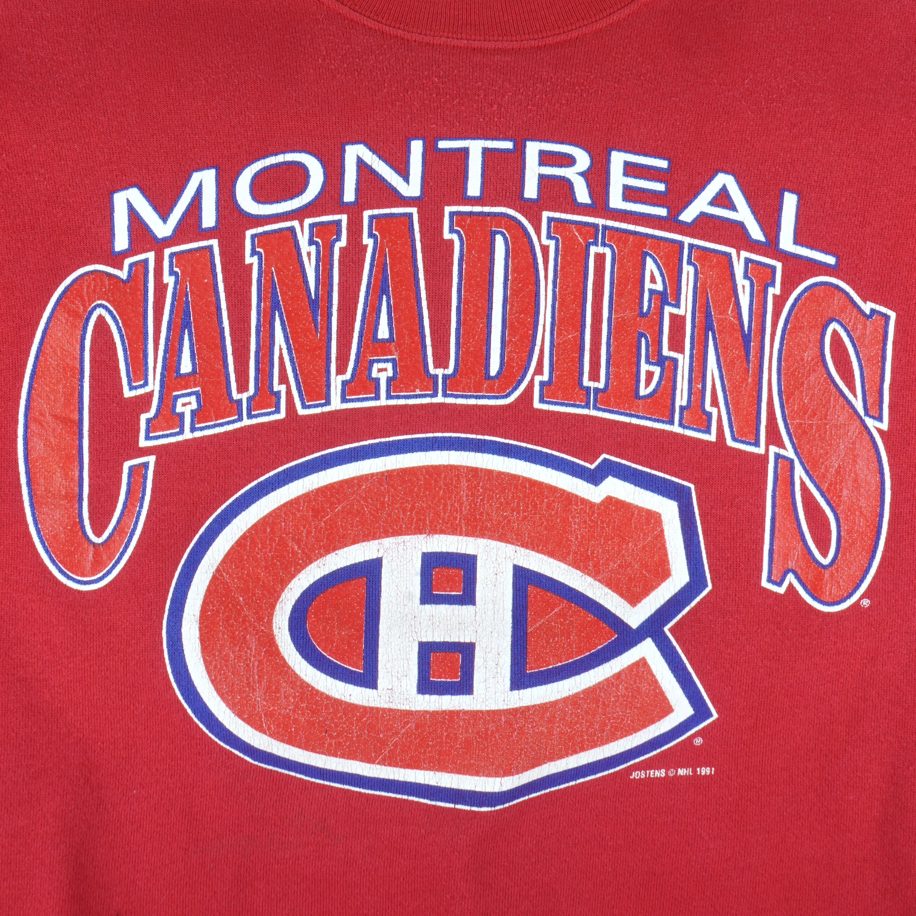 1991 vintage NHL Montreal Canadiens crew neck sweatshirt by Jostens. Red in color, big logo and spell-out, fitting a medium size with signs of wear, minor mark on left sleeve and screen print cracked due to aging and is otherwise in very good condition.