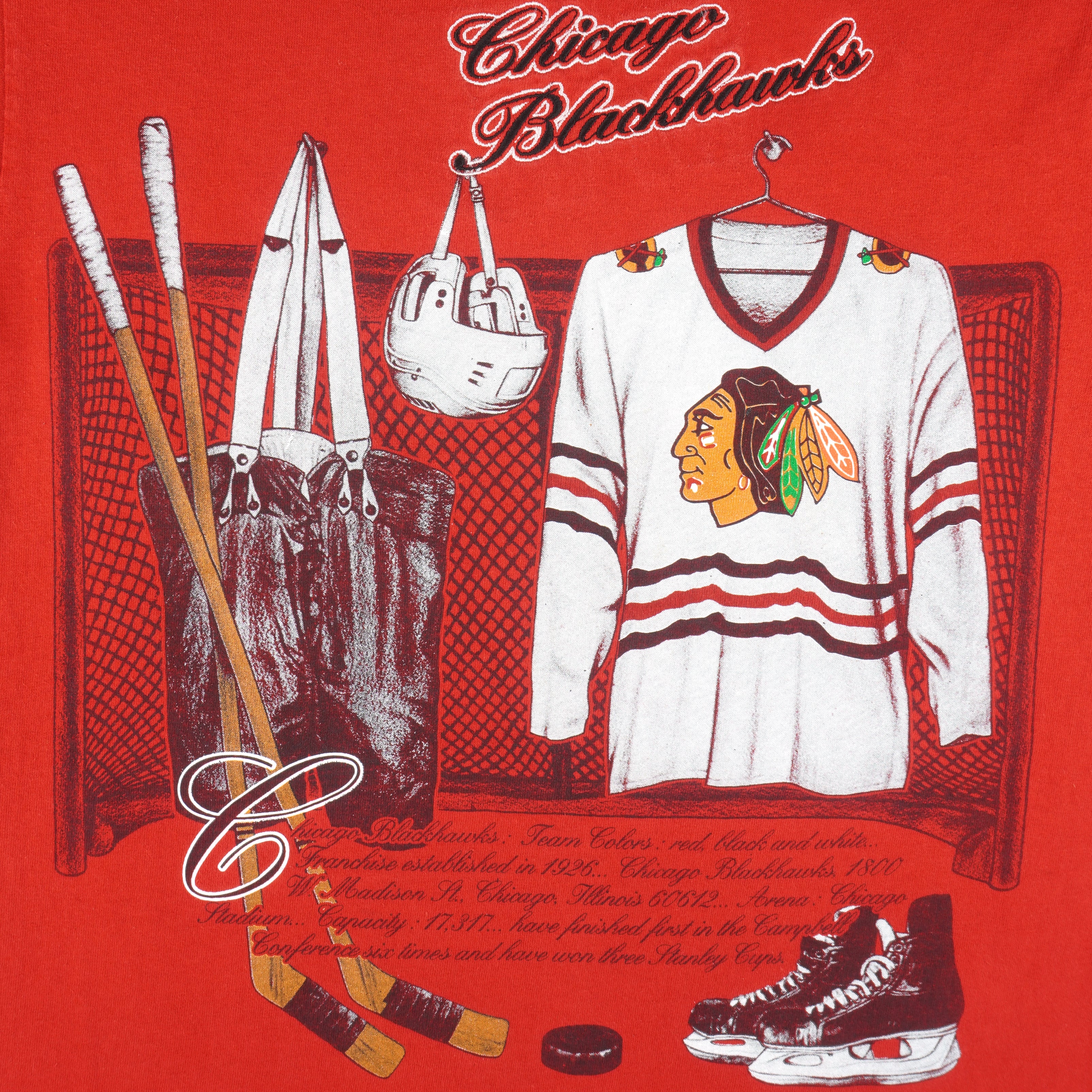 1990s Vintage NHL Chicago Blackhawks Embroidered T-Shirt by Nutmeg. Red in color, tag is large but fits medium size and is in excellent condition.