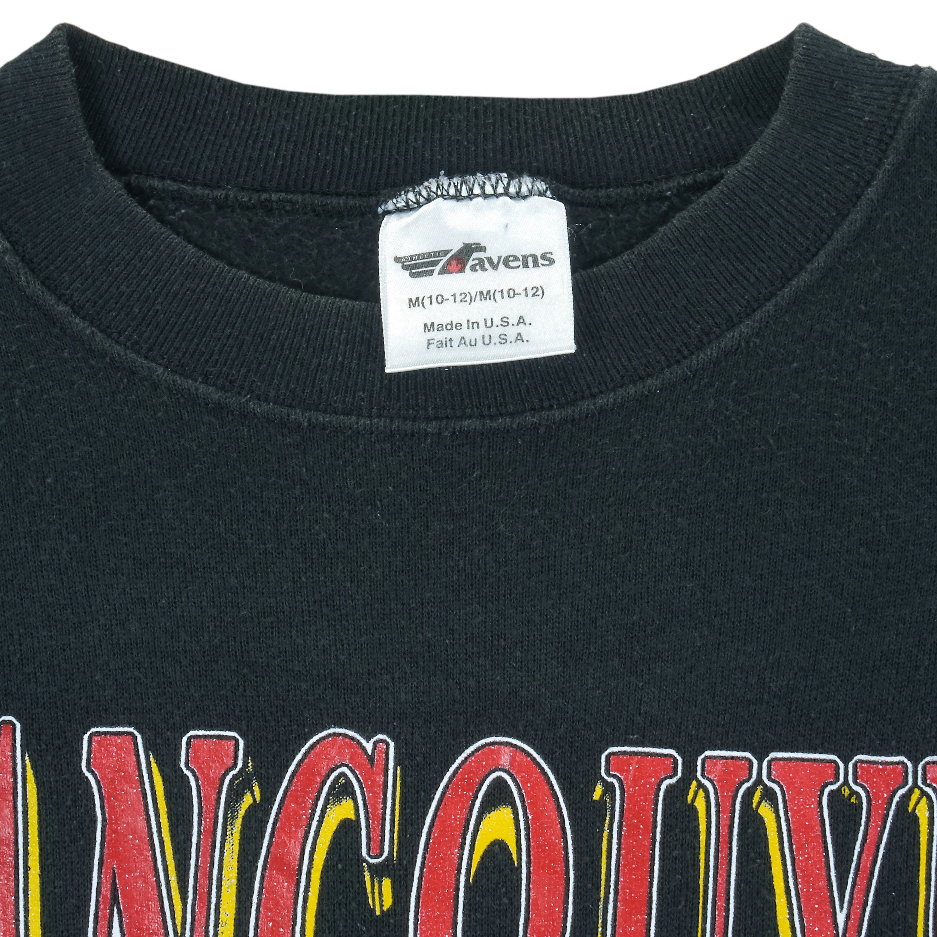 1993 NHL Vancouver Canucks Spell-Out Crew Neck Sweatshirt by Ravens Athletic. Black in color, fitting a medium youth size with signs of wear and is otherwise in very good vintage condition.