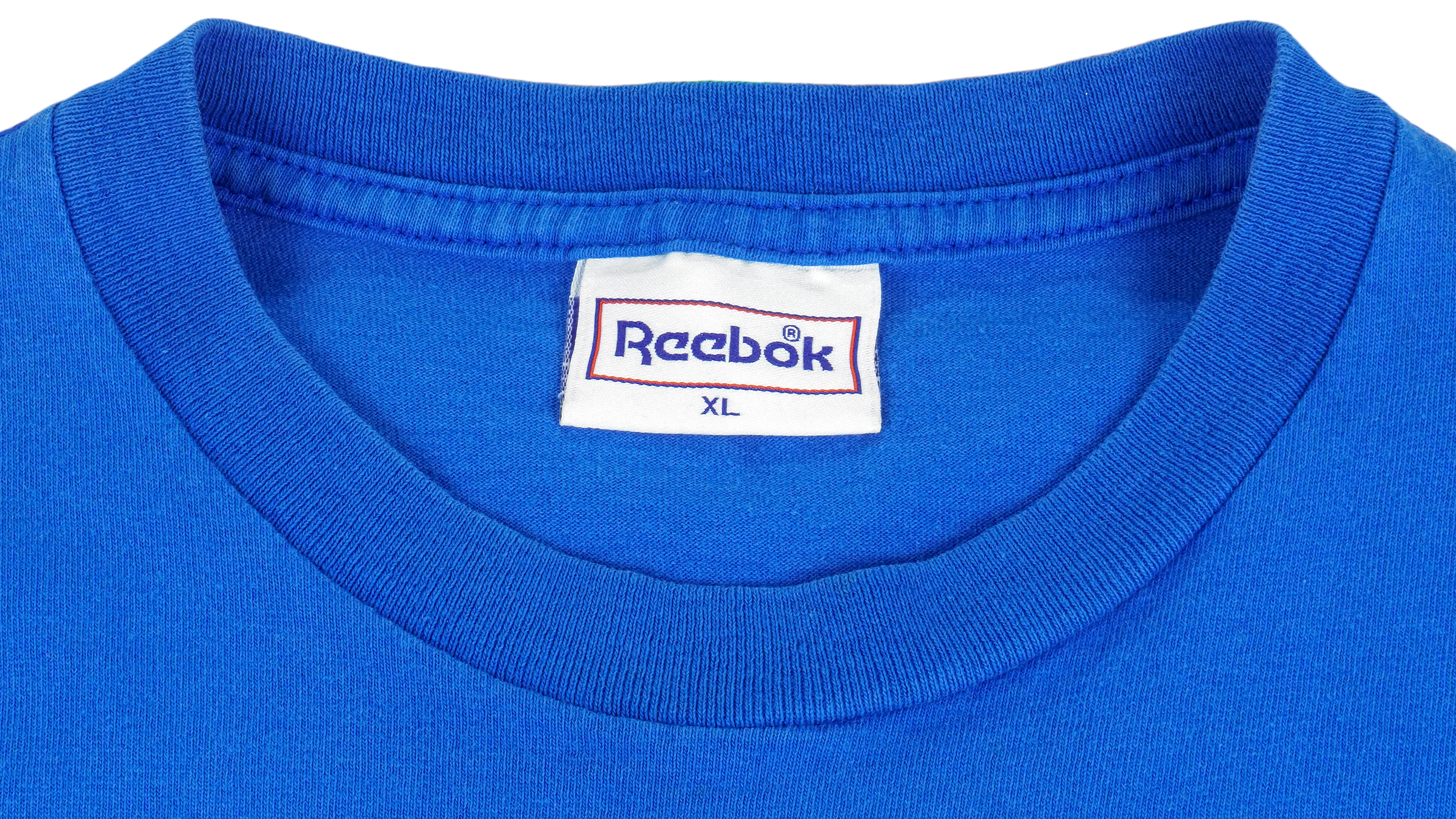 1990s Vintage Reebok Shag with Autograph Big Spell-Out T-Shirt. Blue in color, tag in X-large size but fitting like a medium size with signs of wear and is otherwise in very good condition.