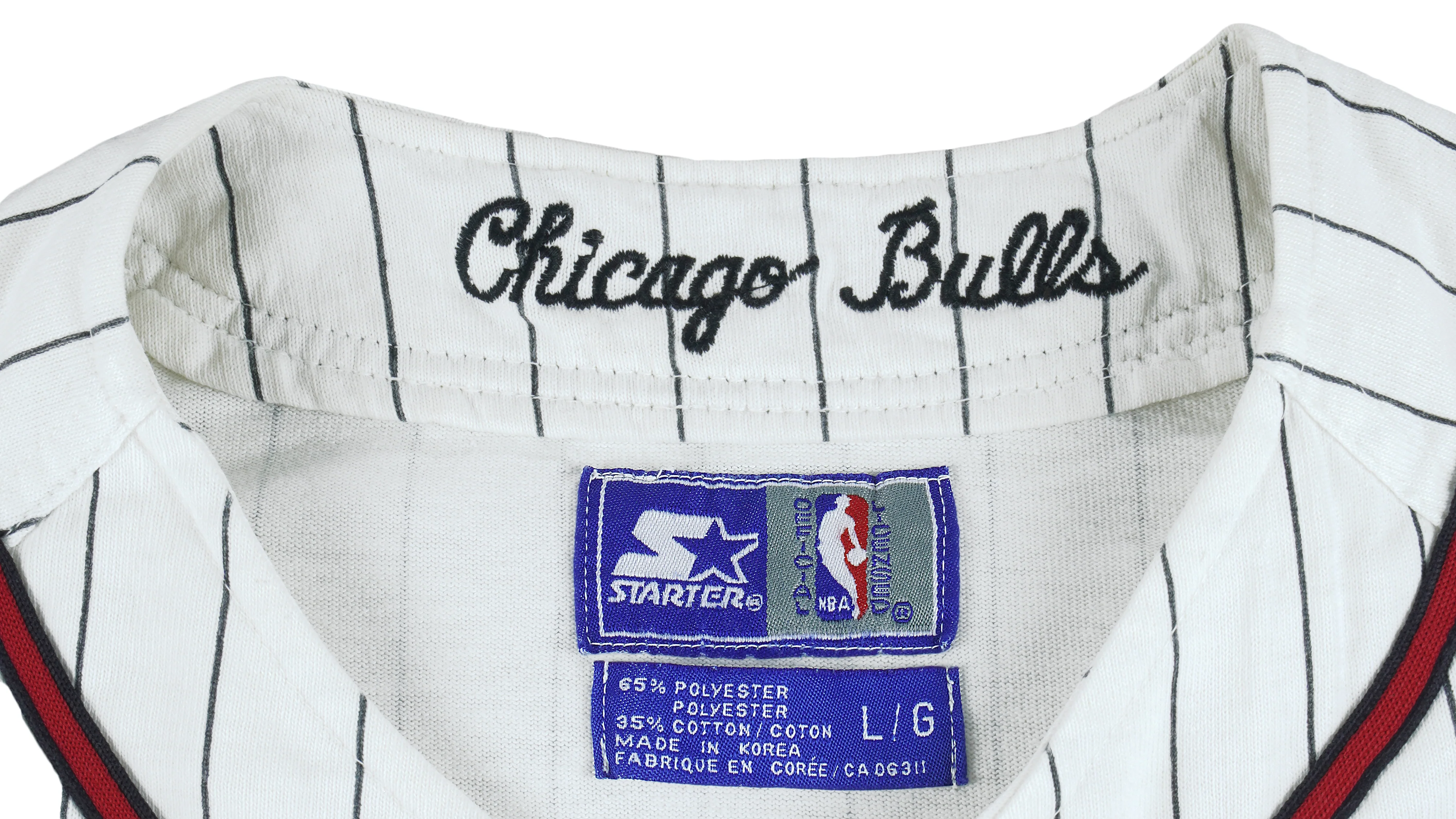 1990s Vintage Starter NBA Chicago Bulls Embroidered Basketball Jersey T-Shirt. White in color, spell-out on the back, fits a large size and is in excellent condition.