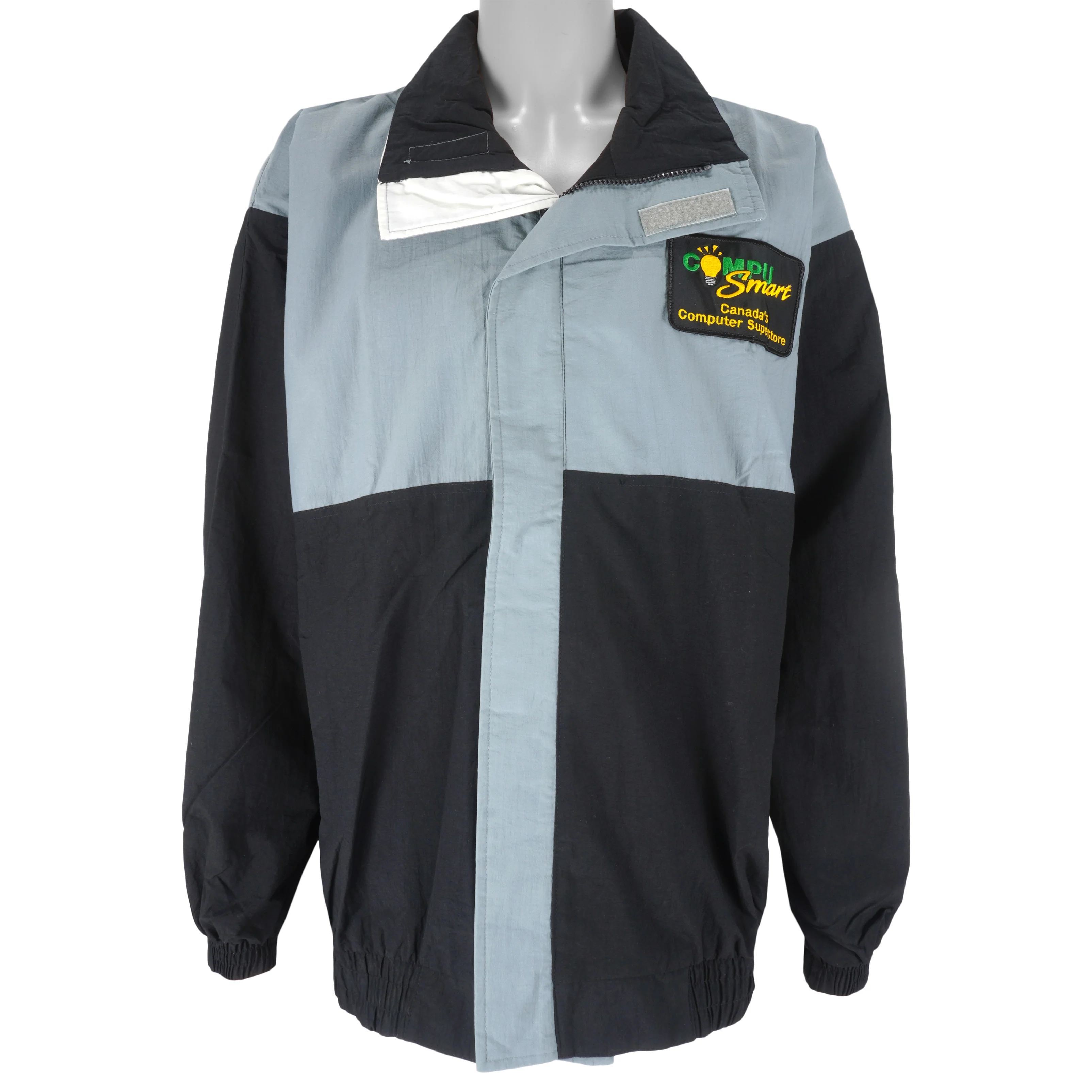 1990s Vintage Compu Smart Canada's Computer Superstore Zip-Up Jacket by Canada. Black and grey in color with big spell-out, fits X-large size and is in excellent condition.
