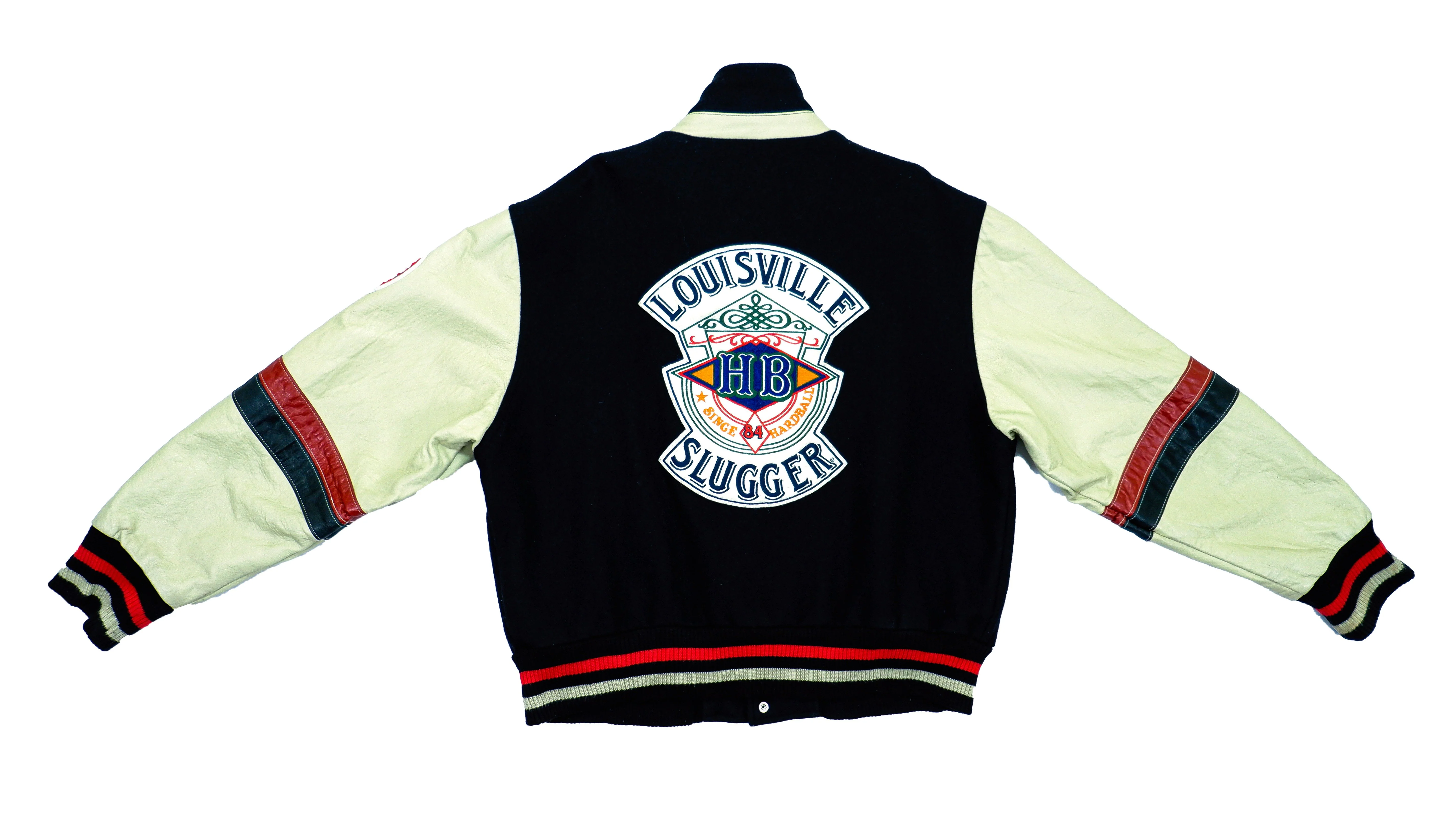 1980s Vintage Louisville HB Slugger Leather Baseball Jacket. Black and Beige color, fitting large and is in excellent condition